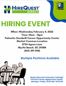 Multiple positions available. Apply at the Palmetto Goodwill Career Opportunity Center, Market Common location.